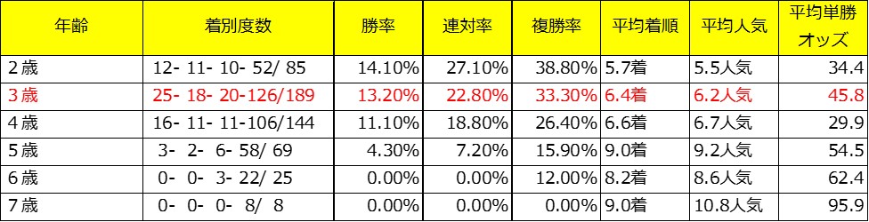 3番目は年齢データです。3歳では(24,11,16,82)と勝率18%、複勝率38.3%です。4歳まではかなりよい成績を残しています。